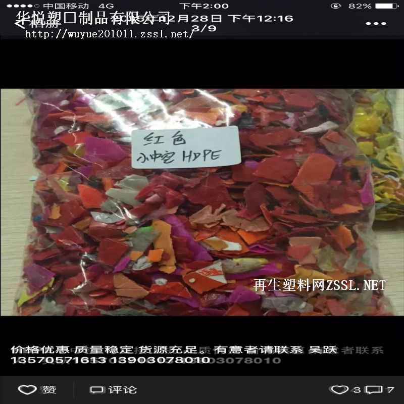 华悦塑胶制品有限公司位于广东省惠州市博罗县石湾镇,长期大量销售:HDPE破碎料、 PP破碎料、 PET吸塑片、PET瓶砖、牛奶瓶、 纸厂料粒子、胶纸。吴跃13570571613,13903078010 |